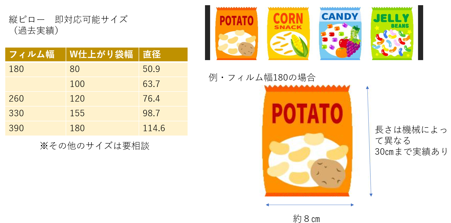 機械作業(設備案内) 機械作業(設備案内) FACILITIES ホーム » 機械作業(設備案内) 当社ではお菓子の小分けに関する様々な設備を導入しています。 縦ピロ―包装機 縦ピロ包装機KBF-6110X型自動包装機(株)川島製作所 2台有り 包装能力6~120rpm シール嚙みこみ検知機能付き チョコレートやキャンディー、ラムネなどを平袋やジッパーに全自動で包装できます。 卓上胴巻きラベラー 卓上胴巻きラベラー ・上面貼りラベラー イーディーエム株式会社 ボトルケースの胴回りにラベルを張ることが出来ます。 給袋式自動包装機 自動充填包装機 TTー10A 型自動包装機(コンベアマガジン式)PACRAFT(株)製 2台有り 包装能力最大60袋/分 チャック開口装置・底開口装置・シール後のチャック密着装置を標準装備 シール噛みこみ検知機能付き 縦ピロ―包装機と同じようにジッパーへの包装が出来ます。グミの包装に使用することが多いです。 計量器 重さや量を測ることができます。